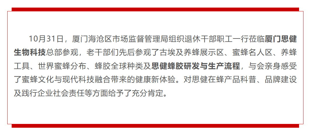 思健科技動(dòng)態(tài) | 海滄市場(chǎng)監(jiān)督管理局退休干部職工參觀思健蜂主題科技館及蜂膠生產(chǎn)車間